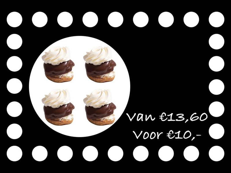 DEZE BLACK FRIDAY ACTIE IS ALLEEN GELDIG OP VRIJDAG 28-11-25 4 moorkoppen voor 10,- De moorkop is een soes gevuld met slagroom, doorgehaald door de chocoladefondant en afgewerkt met een rozet slagroom.