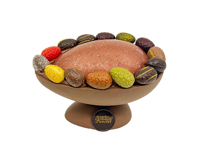 Een strak ei van Belgische chocolade opgemaakt met gevulde paaseitjes.